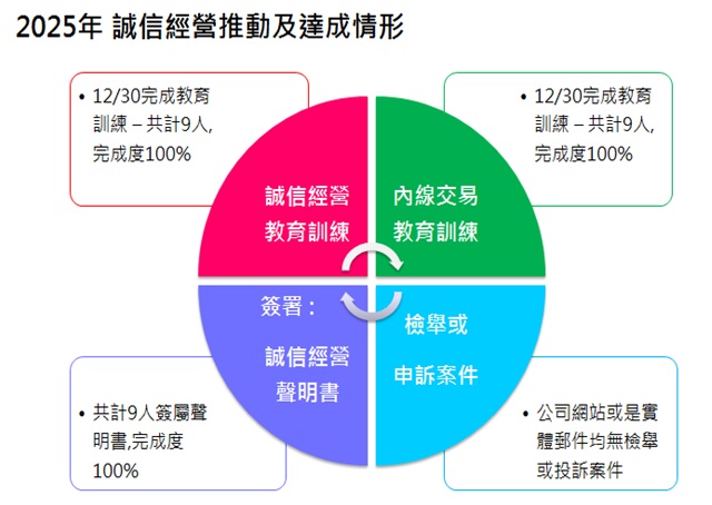 (三) 本公司基於公平、誠信原則從事商業活動,為落實誠信經營政策,積極防範不誠信行為,訂定「誠信經營作業程序及行為指南」,規範作業程序、行為準則、違規之懲戒及申訴制度,以落實執行,並定期透過員工教育訓練宣導誠信經營之要求與精神。113年度於董事會宣達內線交易之案例,計9人次參與,董事會成員亦參與113年度防範內線交易與公司治理座談會等相關進修課程,計畫114年度將持續宣導並落實防範不誠信行為方案。